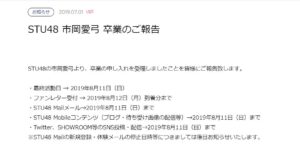1日前にSTU48の由良朱合の卒業が発表された翌日に同グループSTU市岡愛弓の卒業が発表されました。