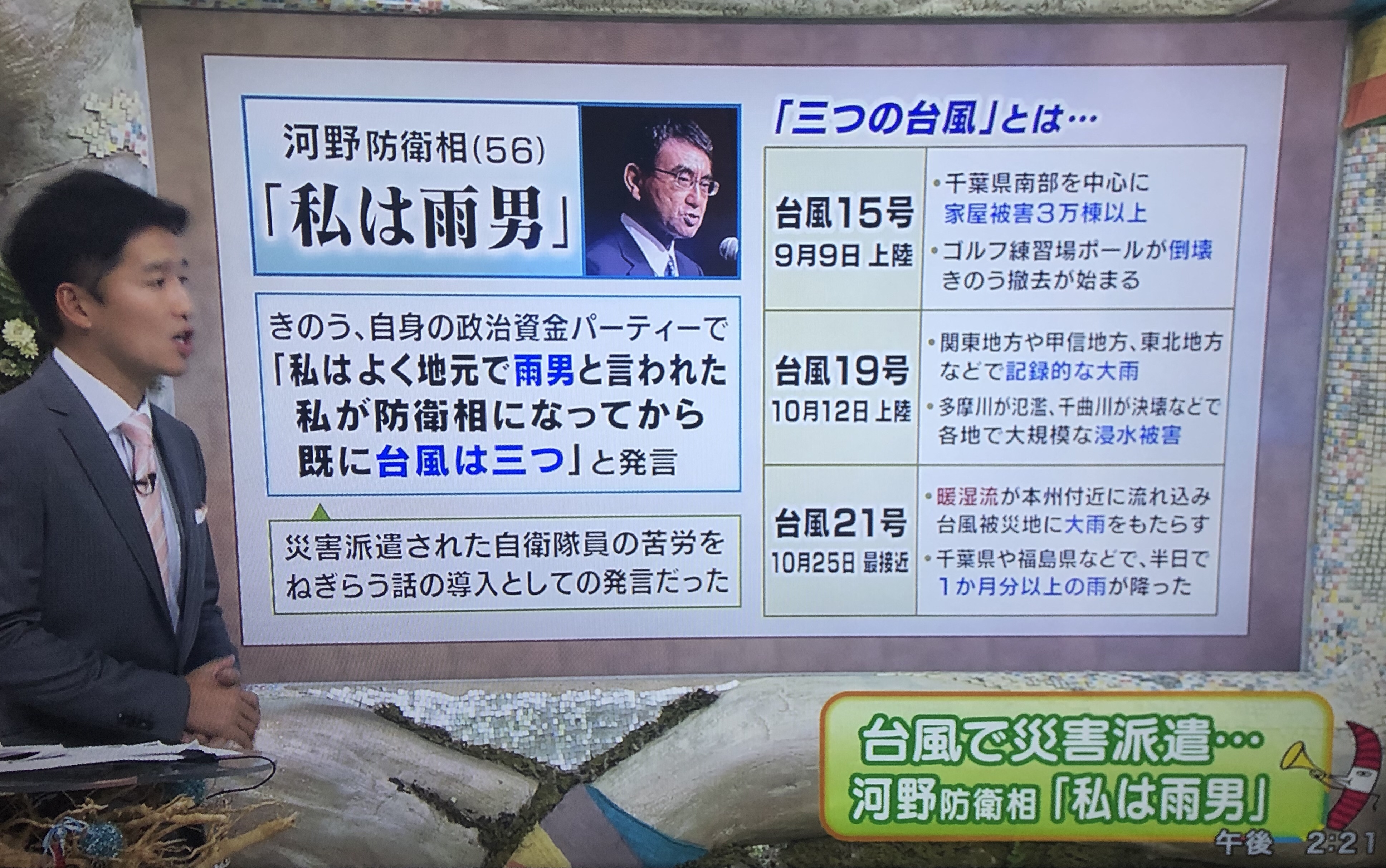 「ここで速報です。河野太郎防衛大臣は先ほど、都内で開かれた自身のパーティーで相次ぐ台風被害に関連し自分はよく雨男と言われたなどと発言しました。」#tvasahi #報st