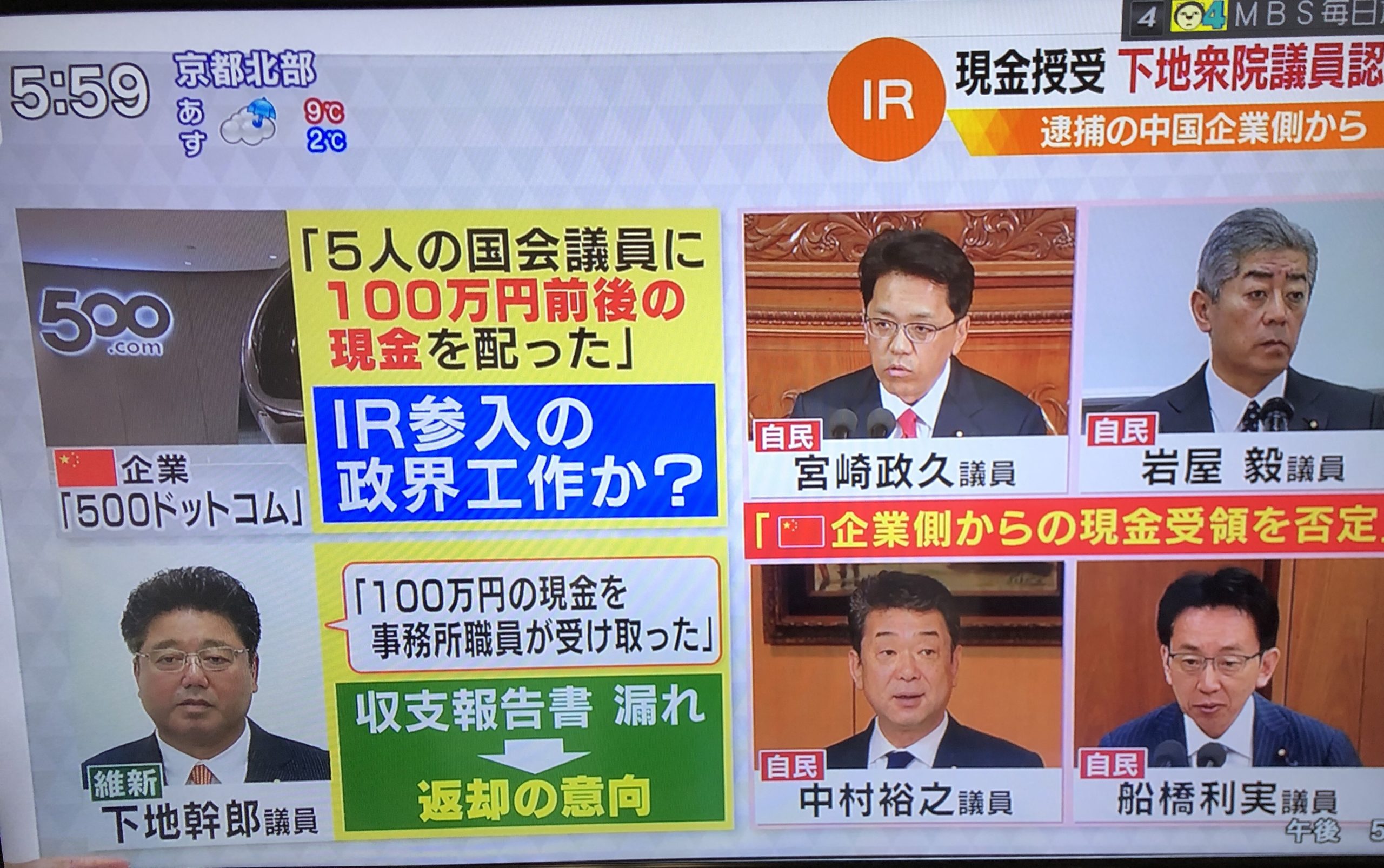 日本でのカジノを含む統合型リゾート施設(IR)事業を巡る汚職事件で、贈賄の疑いが持たれている中国企業「500ドットコム」側が現金約100万円を配ったと供述した5人の国会議員のうち、日本維新の会の下地幹郎衆院議員(58)=比例九州=は6日、那覇市おもろまちの事務所で会見を開き、金銭の授受を認め、速やかに返金する考えを示しました。