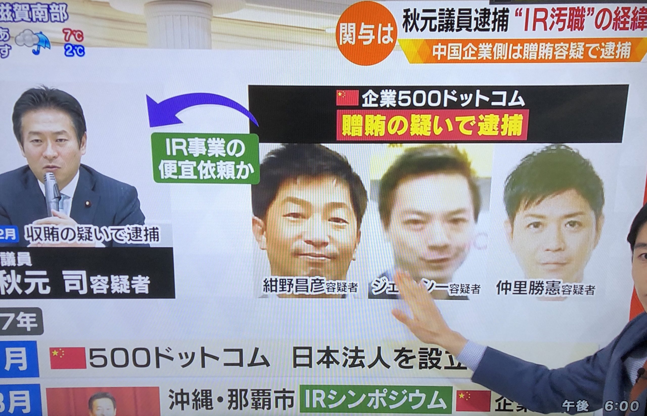 「500」社顧問だった仲里勝憲容疑者(47)=贈賄容疑で逮捕=が、衆院議員秋元司容疑者(48)=収賄容疑で逮捕=に現金300万円を渡した17年9月と同じ頃、国会議員5人に各約100万円を渡したと供述しているという。
