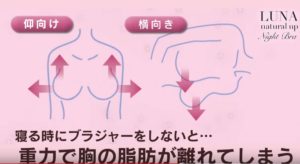 ナイトブラを推奨する理由としては、就寝時にブラジャーをしていないと、重力で胸の脂肪が離れてしまうからです。